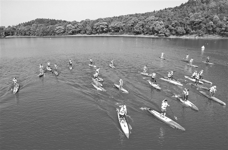 ▲4月9日,桨板运动员在新余市仙女湖凤凰湾水域参加“全民健身·幸福江西”主题竞赛。竞赛设四人龙板、女子单人桨板、男子单人桨板200米冲刺赛以及6000米长程赛,共有来自全省各地的46名桨板运动员参赛。 特约通讯员 赵春亮摄