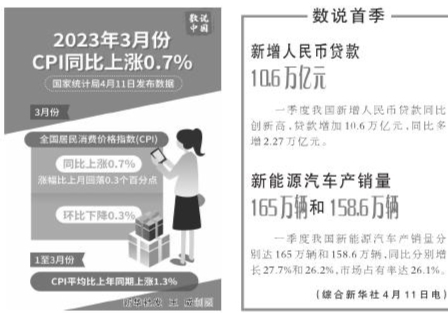 国家统计局城市司首席统计师董莉娟表示,1月份,受春节效应和疫情防控政策优化调整等因素影响,CPI同比上涨2.1%,涨幅比上月扩大0.3个百分点;2月份,受节后消费需求回落、市场供应充足等因素影响,CPI同比涨幅比上月回落1.1个百分点;3月份,生产生活持续恢复,消费市场供应充足,CPI同比上涨0.7%,涨幅比上月回落0.3个百分点。