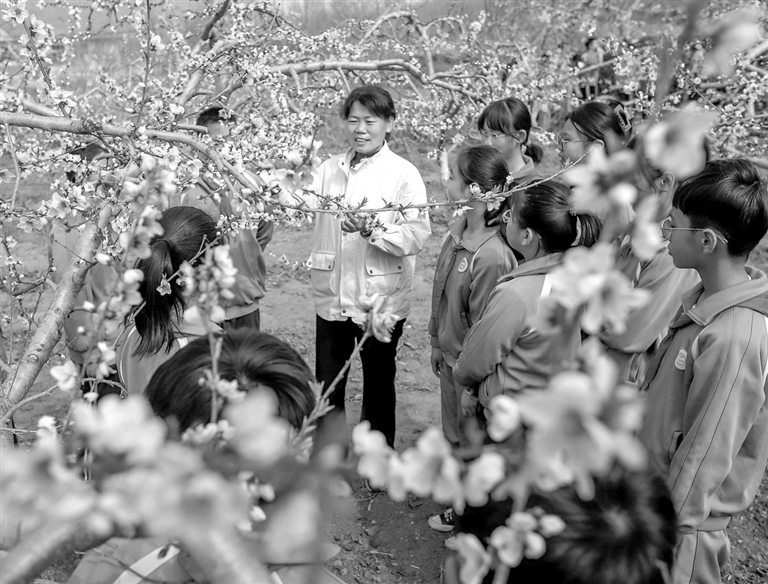 ◀4月10日,技术人员在桃树果园向河北省遵化市东旧寨镇学生介绍桃树生长知识。新华社发 (刘满仓摄)