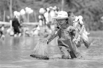 ▶4月10日,四川省广安市武胜县东方红幼儿园的小朋友在龙女镇的稻田里抓鱼。新华社发 (夏俊林摄)