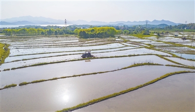 4月9日,新余市仙女湖区,农民驾驶农机在早稻播种前进行最后一遍翻耕。 特约通讯员 赵春亮摄
