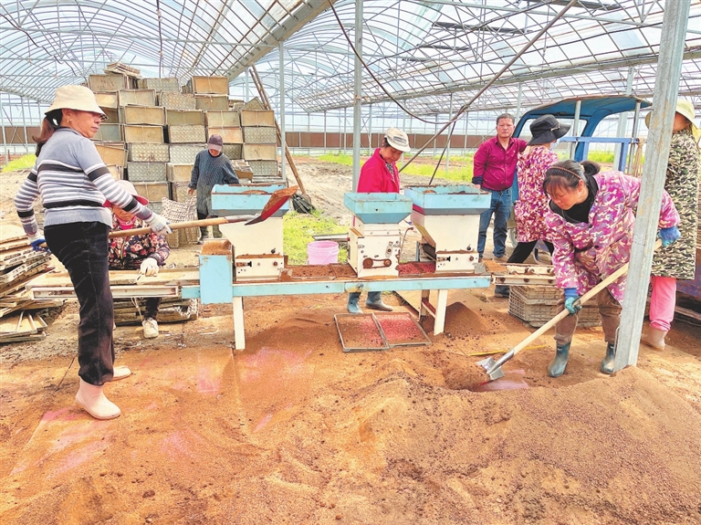 近日,芦溪县现代农业产业园大棚内机械轰鸣,经过铺土、洒水、播种、覆土等环节,一个个完整的育秧盘从机器的另一端输送出来,流水线作业有条不紊。本报全媒体记者 钟进文摄