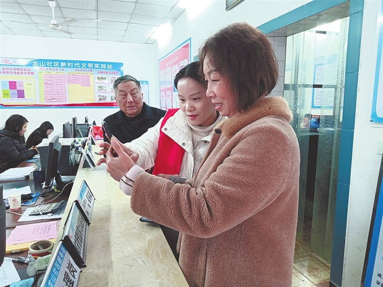 近期,奉新县在中心城区新时代文明实践站设立17个服务网点,组织专职网格员、平安志愿者帮助不会使用智能手机的老人进行网络社保身份认证,确保养老金正常发放。图为龙山社区志愿者在帮助老人确认身份。通讯员 潜 韵摄
