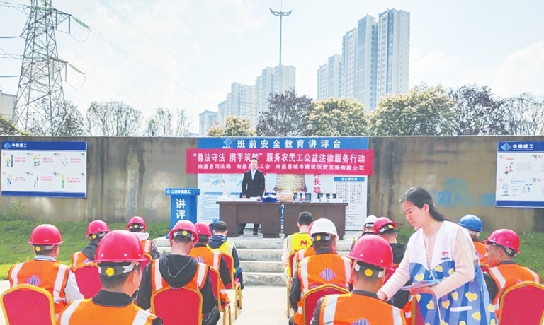 4月7日,南昌县司法局联合县总工会、县城投公司深入银城江苑建筑工地开展服务农民工公益法律服务活动。活动邀请了公益律师参加,现场为农民工讲解施工安全、劳务用工、人身伤害赔偿等相关领域的法律知识。应益民摄