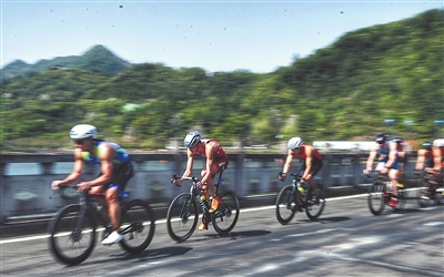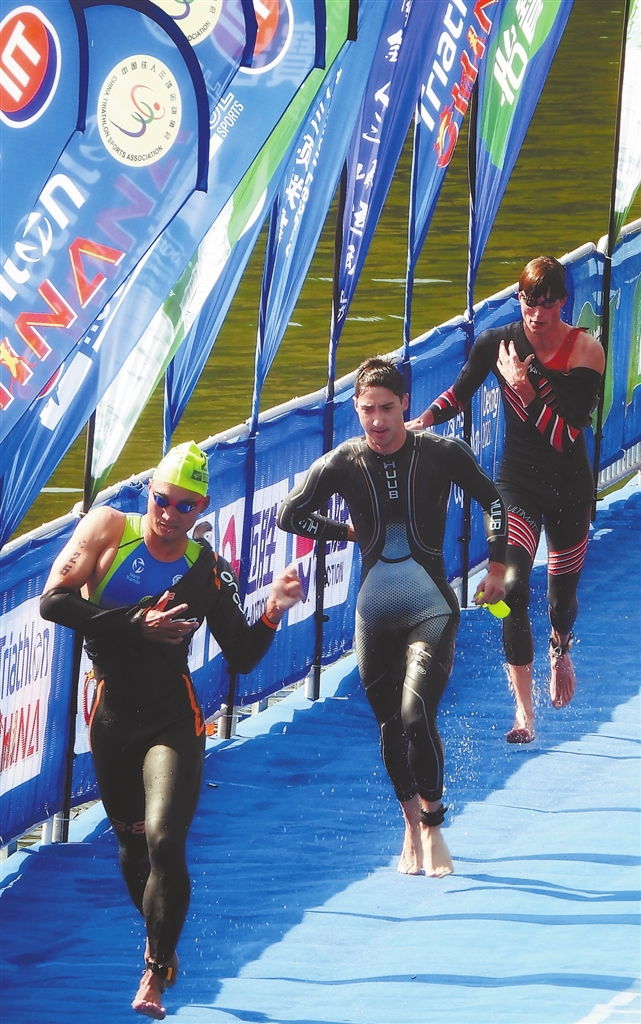 铁人三项赛,选手须先后进行1.5公里天然水域游泳、40公里自行车骑行和10公里公路长跑的比拼。