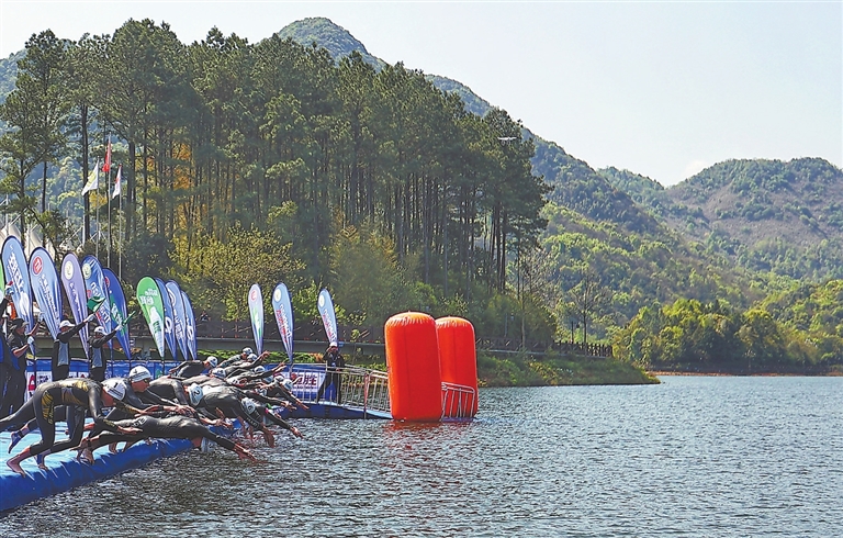 4月8日,赛道内井然有序,看台上座无虚席,2023年铁人三项亚洲杯赛暨中国铁人三项联赛江西德兴站比赛在凤凰湖景区开幕。上午9时,发令汽笛声一响,男子优秀组的选手争相跳入水中,开始比拼第一个项目——游泳。