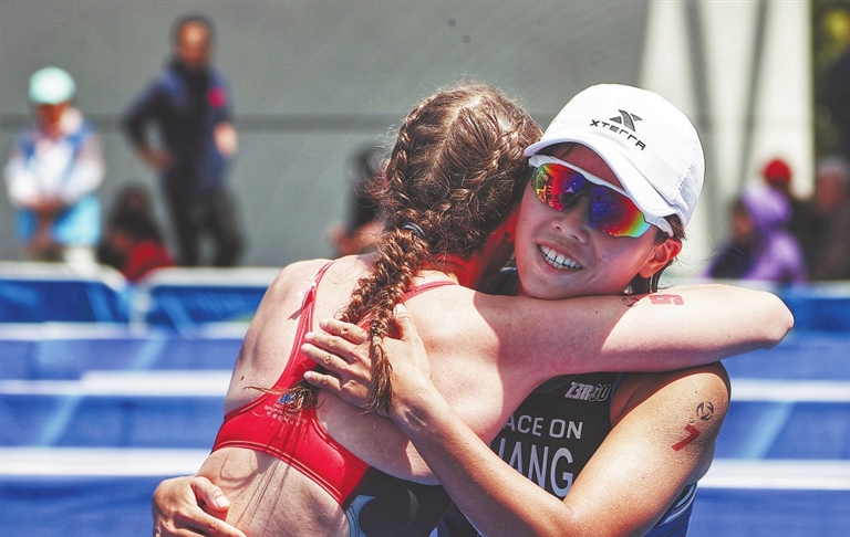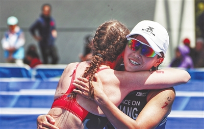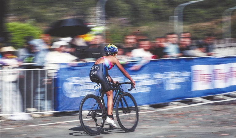 上午10时30分开始的女子优秀组比赛,中国选手黄安琪上演逆转“好戏”,她在游泳、自行车项目一度落后的不利局面下,酣畅淋漓地发挥跑步特长,最终实现反超,以1小时57分58秒的成绩夺得该组别冠军。