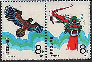1987年4月1日发行的《风筝(第二组)》特种邮票一套4枚(图2),名称分别为“鹰”“龙头蜈蚣”“八卦”和“凤凰”。图案选取了山东潍坊及京津等地民间软翅、平板、立体三类有代表性的风筝,色彩浓艳,以明快强烈的暖色调渲染画面,具有浓郁的民族特色。4幅图案背景统一用深浅相间的蓝色装饰成云彩,并列呈连续起伏状态。4只描画精美的风筝,与背景云彩拉开距离,使画面产生“风筝在天空飘逸”的艺术境界,设计颇为巧妙。每枚邮票的铭记、面值、年代和志号等文字,统一安排在图案底部的位置,上部大面积留空,形成一种疏密对比。