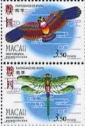 我国港澳台地区也分别发行过风筝邮票。中国香港于1998年发行了一套4枚风筝邮票,图案分别是蜻蜓、龙头蜈蚣和蝴蝶(两枚)风筝,同时发行小全张1枚。中国澳门于1996年发行了一套4枚风筝邮票(图3),图案分别是蜻蜓、猫头鹰、蝴蝶和雏燕风筝,同时发行小型张1枚,主图是龙头蜈蚣风筝。中国台湾也于2001年7月发行了一套风筝邮票,全套4枚横连印。邮票中的风筝分别采用了龙、凤、虎、鱼的造型。