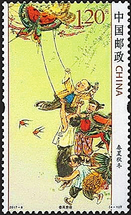 此外,在我国发行的其他题材邮票中,风筝的身影也经常展现于方寸之中。1963年6月1日发行的《儿童》邮票,其中第12枚“春天来了”,图案为一名手持燕子风筝的儿童,这是我国邮票中最早出现的风筝;1998年11月1日发行的1999年中国邮政贺年明信片中的第4枚《中国民间艺术·风筝》;2005年4月15日发行的《放风筝》国际邮资明信片,图为一个手持沙燕风筝的儿童;2005年11月12日发行的《第二十九届奥林匹克运动会——会徽和吉祥物》纪念邮票中的“福娃妮妮”,其原型就是沙燕风筝;2010年4月5日发行的《清明节》特种邮票中的第2枚“踏青”(图4)、2015年2月4日发行的《二十四节气(一)》特种邮票中的第5枚“清明”和2017年3月20日发行的《春夏秋冬》特种邮票中的第1枚“春燕剪柳”(图5),图案均为儿童放风筝的情景。