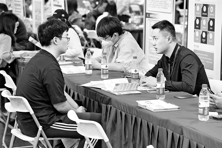 4月16日,学生(左)在春季双选会现场与用人单位交流。当日,南京大学2023届毕业生春季双选会在南京大学仙林校区举办。双选会面向校内外学生开放,吸引了来自北京、上海、南京等地的180家企事业单位参会,提供近1.5万个岗位。