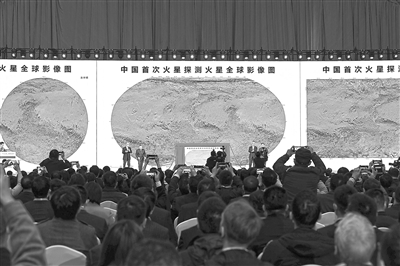 4月24日,在2023年“中国航天日”主场活动启动仪式上,国家航天局和中国科学院联合发布中国首次火星探测火星全球影像图。新华社记者 黄博涵摄