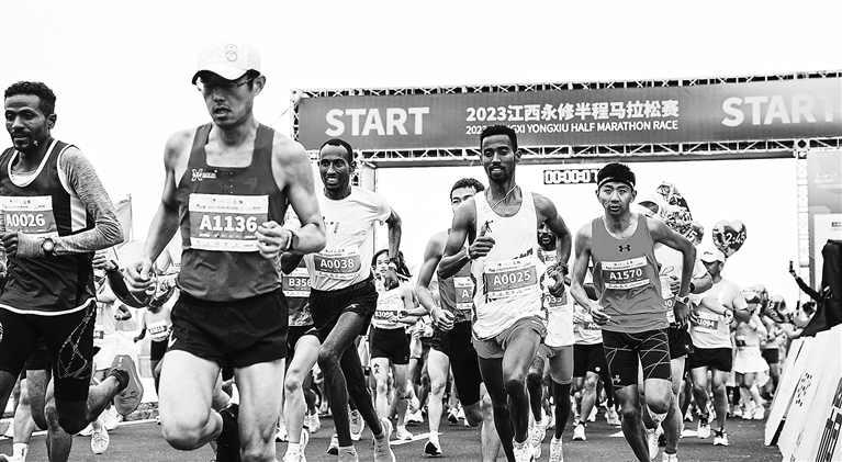 4月22日,“陌上花开·逐梦吴城”2023江西永修半程马拉松赛,在中国候鸟小镇——吴城鸣枪开跑。4500多名中外选手在鄱阳湖腹地驰骋竞速,领略“世界湿地·候鸟王国”的旖旎风光。本次比赛共设置半程马拉松、全民健身跑、党员模范毅行徒步3个项目。本报全媒体记者 梁振堂摄
