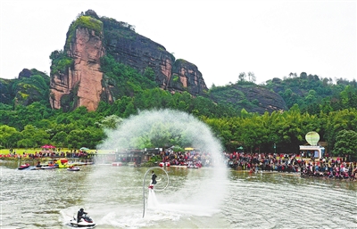 4月29日,游客正在龙虎山景区观看水上表演。“五一”假期,该景区推出一系列精彩活动,吸引游客参与体验。此外,景区设置了多个党员示范岗、咨询服务台和志愿者服务岗,为游客提供交通引导、旅游咨询、行李寄存等服务。通讯员 刘志琨摄