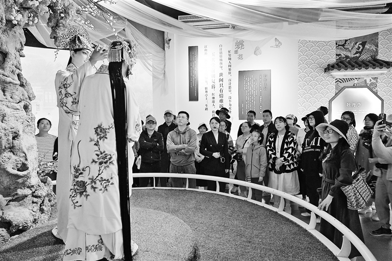 4月30日,抚州市汤显祖纪念馆内人潮涌动,游客正认真聆听讲解员介绍“临川四梦”,感受传统戏曲的艺术魅力。该馆采用360度全景投影、大屏幕影像互动等现代科技手段,展示汤显祖波澜起伏的一生和其经典作品,“五一”假期,迎来一波“打卡”热。