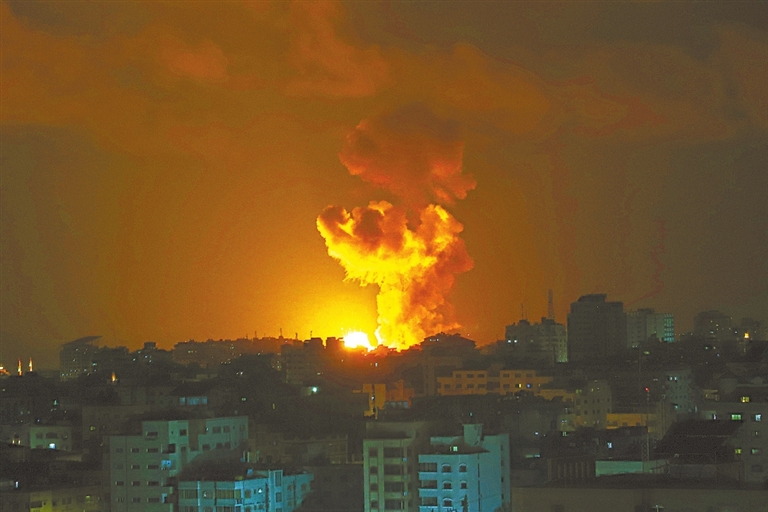 这张5月2日拍摄的照片显示,以军空袭造成的爆炸将加沙城天空照亮。以色列国防军5月2日夜间出动战机对加沙地带多个军事目标发动空袭,以回应当天早些时候来自加沙地带的火箭弹袭击。新华社发(里泽克·阿卜杜勒贾瓦德摄)