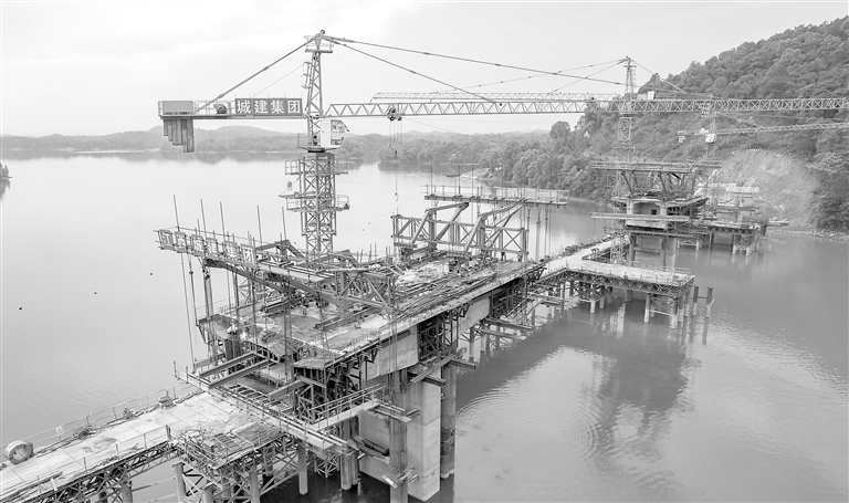 5月2日,在新余市仙女湖钟山峡大桥施工现场,建设者加紧施工保障工程进度。