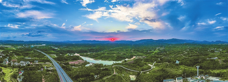 5月3日,无人机俯瞰于都县车溪乡坳背村。夕阳下的田园、水库、村庄、公路相映成趣,构成一幅秀美的乡村画卷。