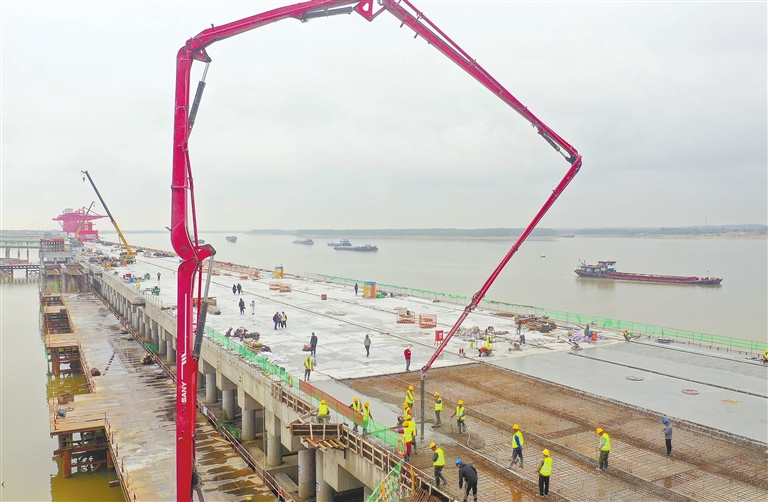 4月25日,在南昌港东新港区姚湾作业区综合码头项目建设现场,工人们正进行码头面层浇筑最后一个分段的施工。随着码头面层浇筑工作的全部完成,标志着该项目16个泊位主体结构顺利完工,步入施工收尾阶段。作为全国一次性批复泊位最多、岸线最长的内河港口码头,姚湾综合码头全部建成后,将成为南昌港最大的现代化内河综合码头,为南昌经济发展提供重要支撑。本报全媒体记者 李 劼摄