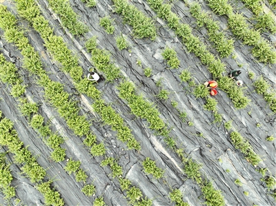 | ▶5月4日,在铅山县金银花种植基地,农民正忙着采摘金银花。近年来,该基地采取“公司+协会+农户”方式,大力种植金银花,并进行深加工,提高金银花附加值,带动农民增收致富。