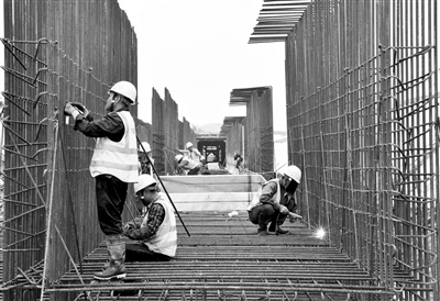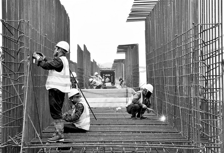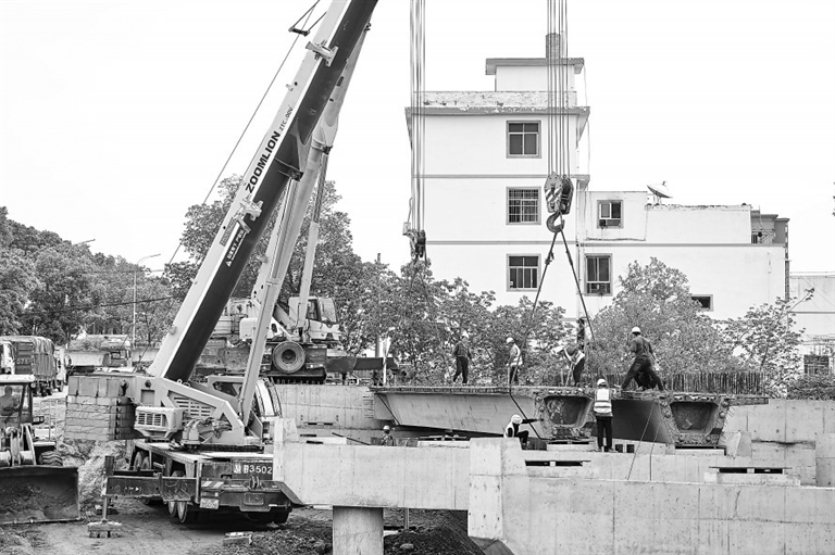 近日,工人在G323赣州市章贡区公路改建项目现场架设桥梁。今年以来,当地加大公路改建力度,全力推动项目建设提速增效。本报全媒体记者 焦俊杰摄