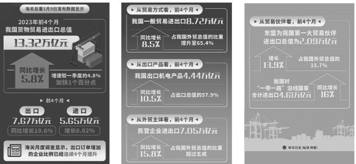 具体来看,前4个月出口7.67万亿元,同比增长10.6%;进口5.65万亿元,增长0.02%。海关月度调查显示,出口订单增加的企业比例已经连续4个月提升。