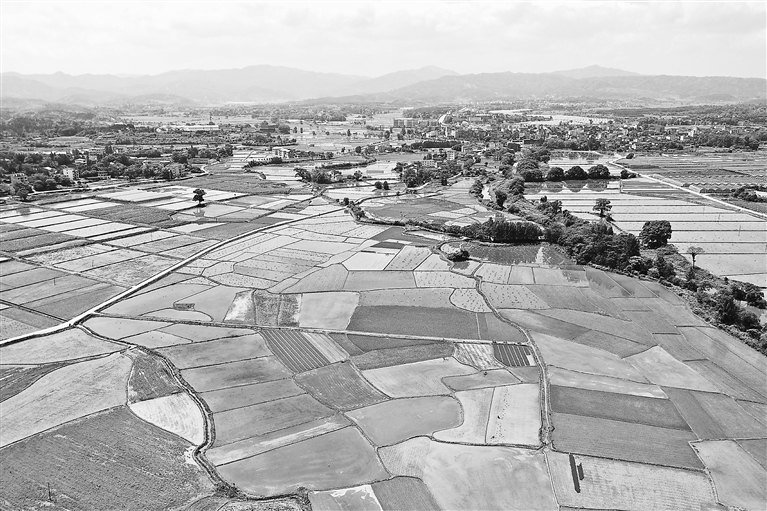 5月9日,在广昌县田间地头,农户正抢抓时节忙着耕种。无人机高空俯瞰,一块块如明镜般的水田和秀美的村庄,在蓝天白云的衬托下交织成一幅美丽的田园画卷。本报全媒体记者 洪子波摄