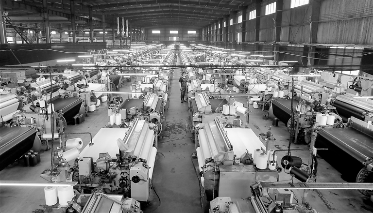 ▶5月9日,在位于广昌县的抚州市鸿源纺织科技有限公司车间,百余台喷水织机在自动化作业,生产忙而有序。今年以来,该企业订单充足,一季度实现主营业务收入4622.4万元,产品远销东南亚、非洲等海外市场。 本报全媒体记者 张翰林摄
