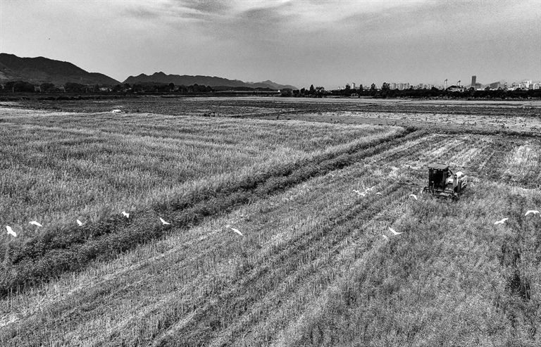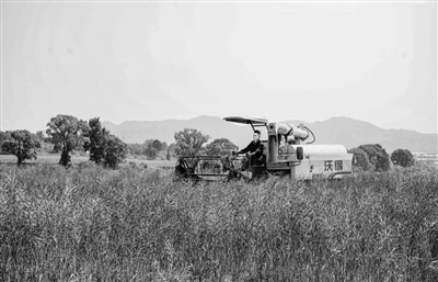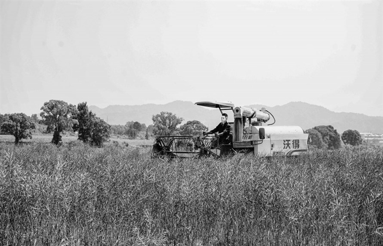 | 5月13日,在瑞昌市赛湖农场二分场油菜基地,农机手正驾驶收割机采收油菜籽。初夏时节,该市20余万亩油菜迎来收获期。特约通讯员 魏东升摄 |