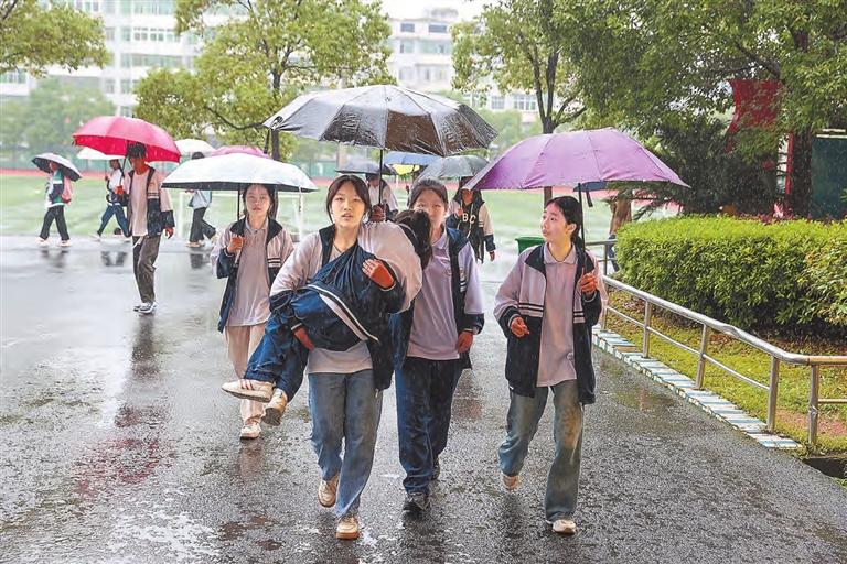 5月10日14时许,淅沥沥的雨下个不停,在新余市分宜三中校园里,初二学生张可心等人抱着不能行走的小雨(化名)到教室上课,成为校园里一道感人的风景线。