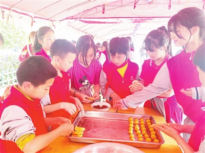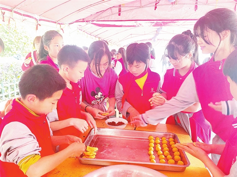 4月28日,万载县高城镇中心小学开展以“五育融合促‘双减’,共赴劳动最光荣”为主题的红薯节系列活动,以劳育人,赋能成长。图为学生制作万载传统小吃——红薯油货。易 瑾摄