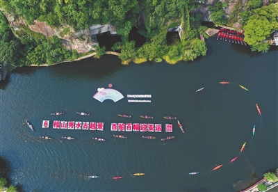 当天上午,百条乌篷船、皮划艇集结在绍兴市东湖景区核心水域,每条船的船头放置了一张亚洲国家最具特色的景点照片,展现了“和合共生”的亚洲文化,象征着亚洲人民的团结与友谊,为喜迎第十九届杭州亚运会营造了浓厚氛围。