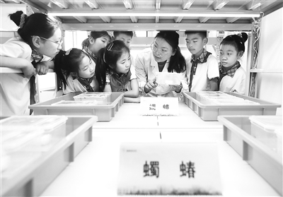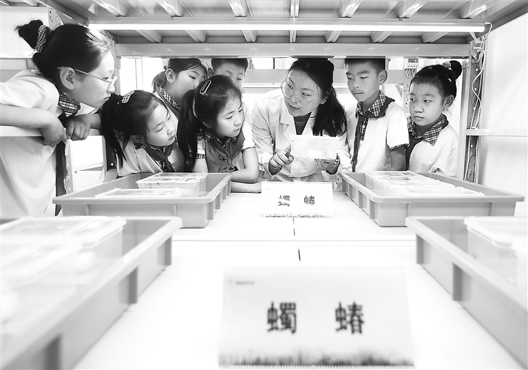 5月22日,在中国农业科学院青岛特种作物研究中心试验基地,工作人员为小学生讲解农作物害虫绿色防控技术。
