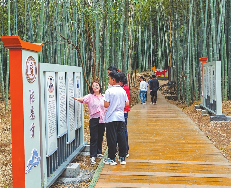 5月23日,抚州市东临新区党员干部在灵谷峰景区内,为游客介绍当地廉洁先贤的优秀家风故事。该新区精心打造抚州首家户外“廉洁文化基地”,使廉洁文化可观、可感、可触。