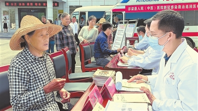 5月23日,在浮梁县王港乡坑口村新时代文明实践站,来自县人民医院的志愿者正在为群众提供医疗卫生服务。该县以新时代文明实践站为依托,广泛开展点对点志愿服务,受到群众欢迎。本报全媒体记者 王景萍摄