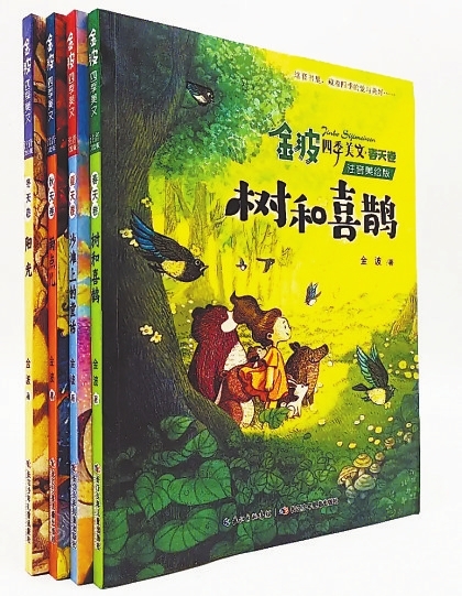 我十分喜爱《金波四季美文》。阳光、雨露,采蘑菇、捉迷藏等大自然和生活小事,在金波爷爷的笔下,是那么的鲜活灵动、温暖有趣。“早晨,我拉开窗帘,阳光就跳进了我的家。”你看,这阳光多么顽皮和讨人喜欢。“难道你是变成那只小花狗了,变成那只会下蛋的老母鸡了,还是变成又香又美的花了?你藏到了哪儿呢?”你看,小朋友的想象多么丰富,捉迷藏时的心思多么纯真有趣。