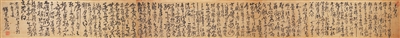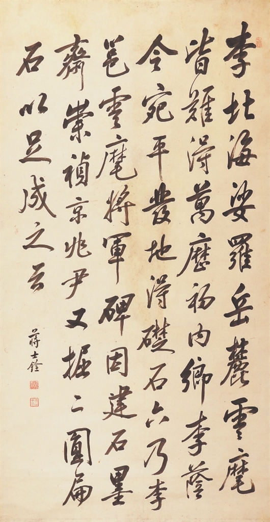 清代蒋士铨(1725-1784),字心余,又字苕生,铅山人,著名戏曲家、文学家,乾隆二十二年进士,改翰林院庶吉士,散馆授编修。他精戏曲,工诗文,与袁枚、赵翼合称“三大家”,著有《忠雅堂集》《红雪楼九种曲》等。他的书法清逸绝俗,出入于南宫、山谷间。袁枚说他“晚年虽病废,而神明不衰,左手作字,横斜入古”。这件展出的行书立轴(图中)内容为书论,高1.41米,宽0.74米,书法气息典雅。
