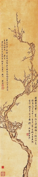 《古梅清芬图》高1.1米,宽0.25米,有题款两处,其一为“写梅花每带篆籀古法,扬补之极得此意。新春日作于舟中。春为一岁首,梅占百花魁。写此一枝为中台君发挥也。黄海并识”;其二为“春江写得一枝斜,舟过浔阳春已赊。闻说风流贤太守,清高真个似梅花。奉呈梦藜太守大人为他年调鼎之兆并乞教之。黄海”。《匡庐村居图》高0.37米,宽0.66米,款识为“日向匡庐望,经年未得攀。为君写此景,却是故乡山。丁卯立夏前一日写为济东仁兄雅属即正。卧云弟黄海”。