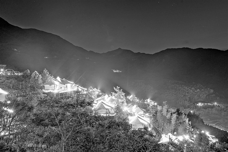 5月29日晚,遂川桃源梯田景区灯光璀璨,依山而建的帐篷营地在灯光映射下格外美丽。去年以来,该景区投资3亿余元,因地制宜、依山而建打造帐篷营地、花街商业休闲区、特色精品民宿等,实现从单一的山色向古色、茶色、夜色多元转变。