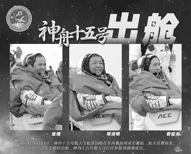 6月4日6时33分,神舟十五号载人飞船返回舱在东风着陆场成功着陆,航天员费俊龙、邓清明、张陆全部安全顺利出舱,神舟十五号载人飞行任务取得圆满成功。
