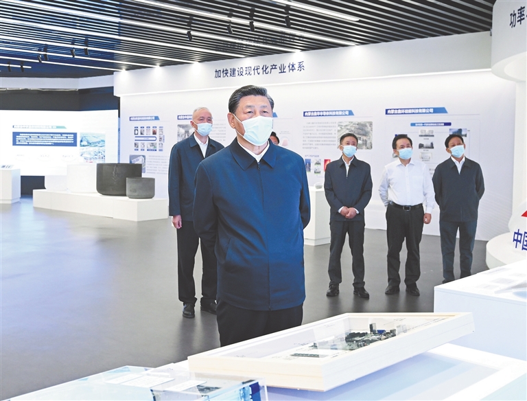 7日下午,习近平来到中环产业园考察。在园区展厅,习近平听取当地发展新能源新材料产业、促进产业结构优化调整、推动绿色低碳发展等情况介绍。随后,习近平来到生产车间实地察看产品生产流程,详细了解园区企业半导体和光伏材料等产品的研发生产情况。他强调,坚持绿色发展是必由之路。推动传统能源产业转型升级,大力发展绿色能源,做大做强国家重要能源基地,是内蒙古发展的重中之重。在这方面内蒙古方向明确、路子对头、前景很好,大有作为、大有前途。离开园区时,习近平亲切地对前来欢送的企业员工说,你们企业和园区办得不错,看了感到很提气。现在,我们要靠高水平科技自立自强、构建新发展格局来攻克科技难关。构建国内大循环是为了保证极端情况下国民经济能够正常运行,这同参与国际经济循环是不矛盾的。我们坚定不移实行高水平对外开放,敞开大门搞建设,一起合作实现共赢。习近平祝愿企业和员工继续努力,芝麻开花节节高,更上一层楼。
