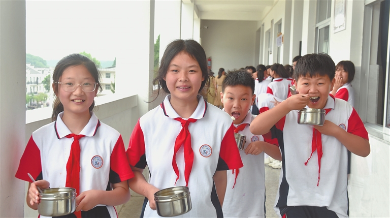 6月6日,在乐平市洪岩镇历居山小学,该校小学生尽享可口的免费午餐。据悉,免费午餐采取“5+N”模式,由中国社会福利基金会出资每人5元/餐,当地政府出资配套费用保障厨师工资、水电燃气等必要开支。目前,该市共有31所偏远山区小学的4600余名师生吃上了干净、可口、营养的免费午餐。特约通讯员 朱定文摄