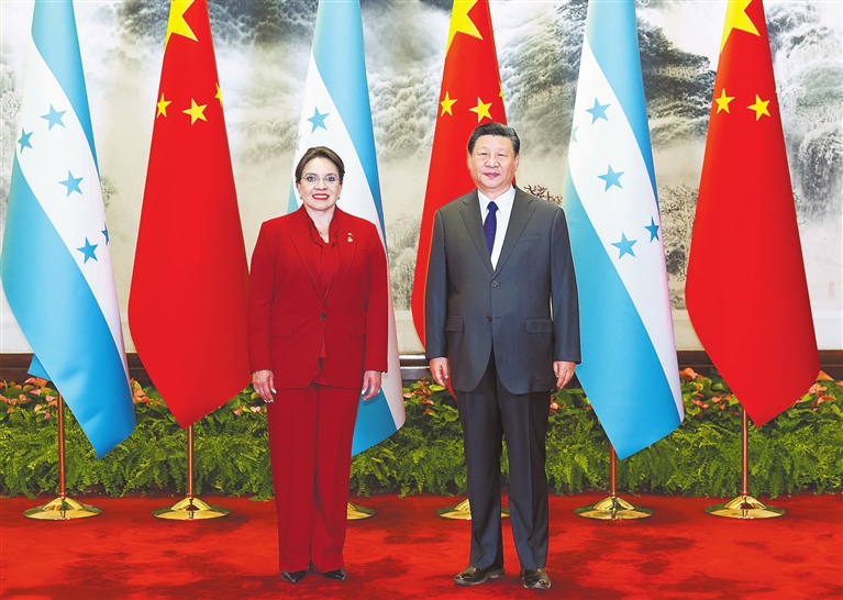 习近平指出,卡斯特罗总统是首位对中国进行国事访问的洪都拉斯总统,你的访问开启了中洪关系新的历史篇章。今年3月中国同洪都拉斯建立外交关系以来,两国关系快速起步,开局良好,呈现出蓬勃活力和广阔前景。中洪建交功在当今,利在长远。中方将坚定不移发展中洪友好关系,坚定支持洪都拉斯经济社会发展,愿同洪都拉斯做相互尊重、平等互利、共同发展的好朋友、好伙伴。我愿同你一道,从战略高度和长远角度引领和推动双边关系深入发展,把两国合作的美好愿景变为实实在在的成果,给两国人民带来更多福祉。相信在双方共同努力下,中洪关系一定会行稳致远,驶向光明未来。