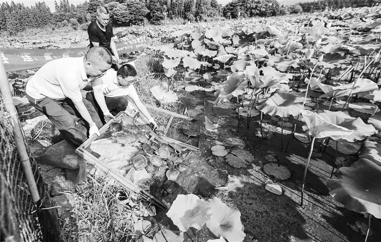 6月8日,工作人员正在向莲田投放甲鱼苗。为提升综合种养效益,广昌县在莲田套养甲鱼,实现绿色生态循环种养。
