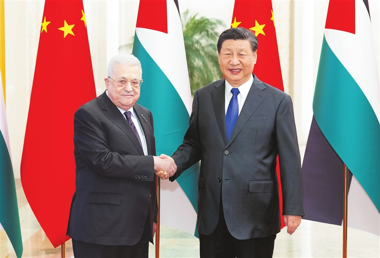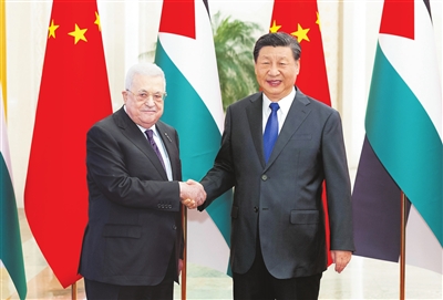 习近平指出,中巴两国是相互信任、彼此支持的好朋友、好伙伴。中国是最早承认巴勒斯坦解放组织和巴勒斯坦国的国家之一,始终坚定支持巴勒斯坦人民恢复民族合法权利的正义事业,推动巴勒斯坦问题早日得到全面、公正、持久解决。中方支持巴勒斯坦成为联合国正式会员国,将继续在多边场合为巴方仗义执言、主持公道,愿继续向巴方提供力所能及的援助,帮助巴方缓解人道主义困难、开展重建。中方愿同巴方以建立战略伙伴关系为契机,继续在彼此核心关切问题上坚定相互支持,全面推进各领域友好合作,深化共建“一带一路”合作,加快中巴自由贸易协定谈判,加强治国理政经验交流,赓续传统友好。