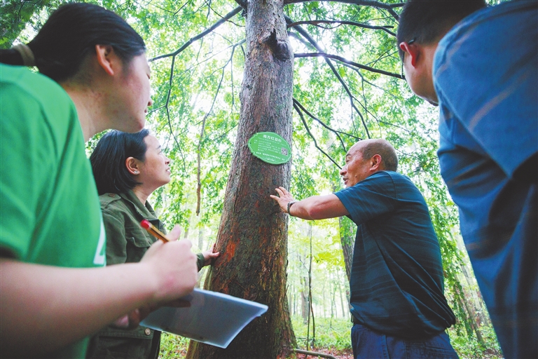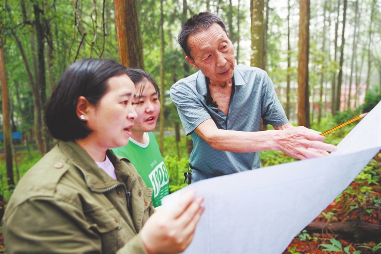 6月5日,靖安县三爪仑乡骆家坪,绿树成荫,郁郁葱葱。76岁的朱赳夫指着眼前的一片山林对女儿朱非可和外孙女聂博宇说:“这片林子我们当年种下去时,只有膝盖这么高,现在已经长到20多米高了”。