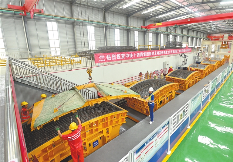 6月16日,在中铁十四局昌九高铁7标管片预制场,建设人员正在将钢筋笼入模。日前,随着我省最大直径14.3米盾构管片正式投产,标志着京港高速铁路九江至南昌段大直径盾构管片工程施工迈出关键一步。本报全媒体记者 李 劼摄