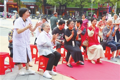 6月16日,我省首位南丁格尔奖章获得者章金媛女士(左二)在教居民健康操。当日,农工党南昌市西湖区总支联合南昌市西湖区卫健委、丁公路街道办事处开展家庭医生签约暨“环境与健康宣传周”义诊宣传活动。