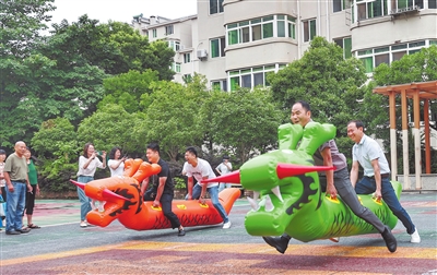 | ▶ 6月13日,南昌市湾里管理局幸福街道招贤社区,居民在进行旱龙舟比赛。端午将至,招贤社区通过举办旱龙舟、包粽子、佩香囊等丰富多彩的活动,让居民在民俗体验中迎接传统佳节。本报全媒体记者 徐 铮摄 |