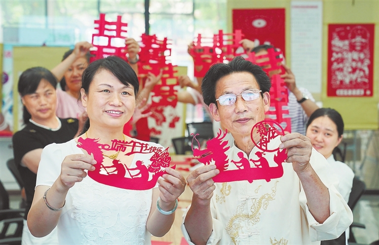 | ▼ 6月15日,新余市渝水区袁河街道丽竹社区开展“学非遗 迎端午”特色文化主题活动,邀请当地非遗剪纸传承人传授剪纸艺术,传承中华优秀传统文化。本报全媒体记者 邹宇波摄 |
